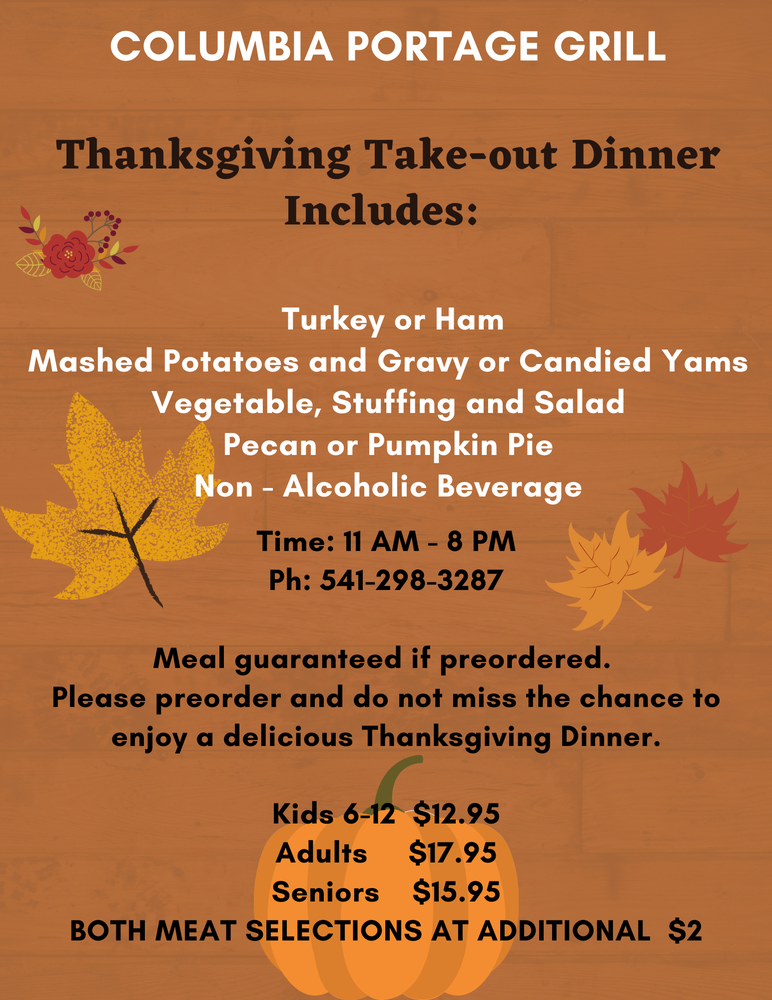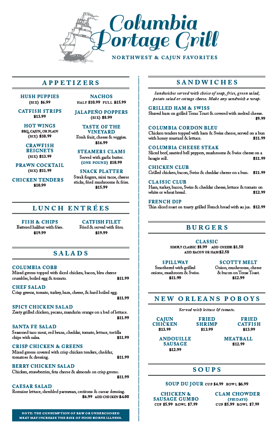 Columbia Portage Grill offers a diverse menu featuring Barbecue, American, and Seafood dishes. With a range of utilities including reservation services, takeout, delivery, and catering options, this restaurant ensures convenience. Located in The Dalles, Oregon, the grill provides a pleasant dining experience with outdoor seating, free Wi-Fi, and a full bar. Customers rave about the food quality and service, with reviews praising the Prime Rib special, Chicken Po Boy, Cobb Salad, and Kids Spaghetti. The atmosphere is cozy, the staff friendly, and the view spectacular. Despite occasional wait times, patrons appreciate the hustle of the staff and the delicious offerings. Overall, Columbia Portage Grill is a must-visit destination for a delightful dining experience in The Dalles.